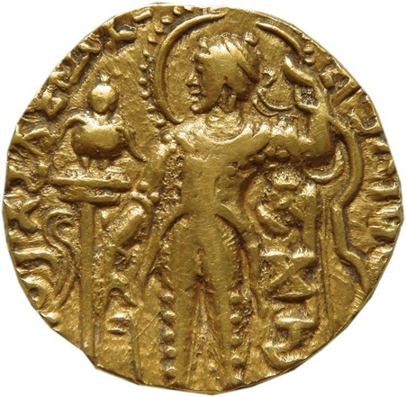 गुप्त सम्राट समुद्रगुप्तच्या नाण्यावर डावीकडे दिसणारा गरुडध्वज